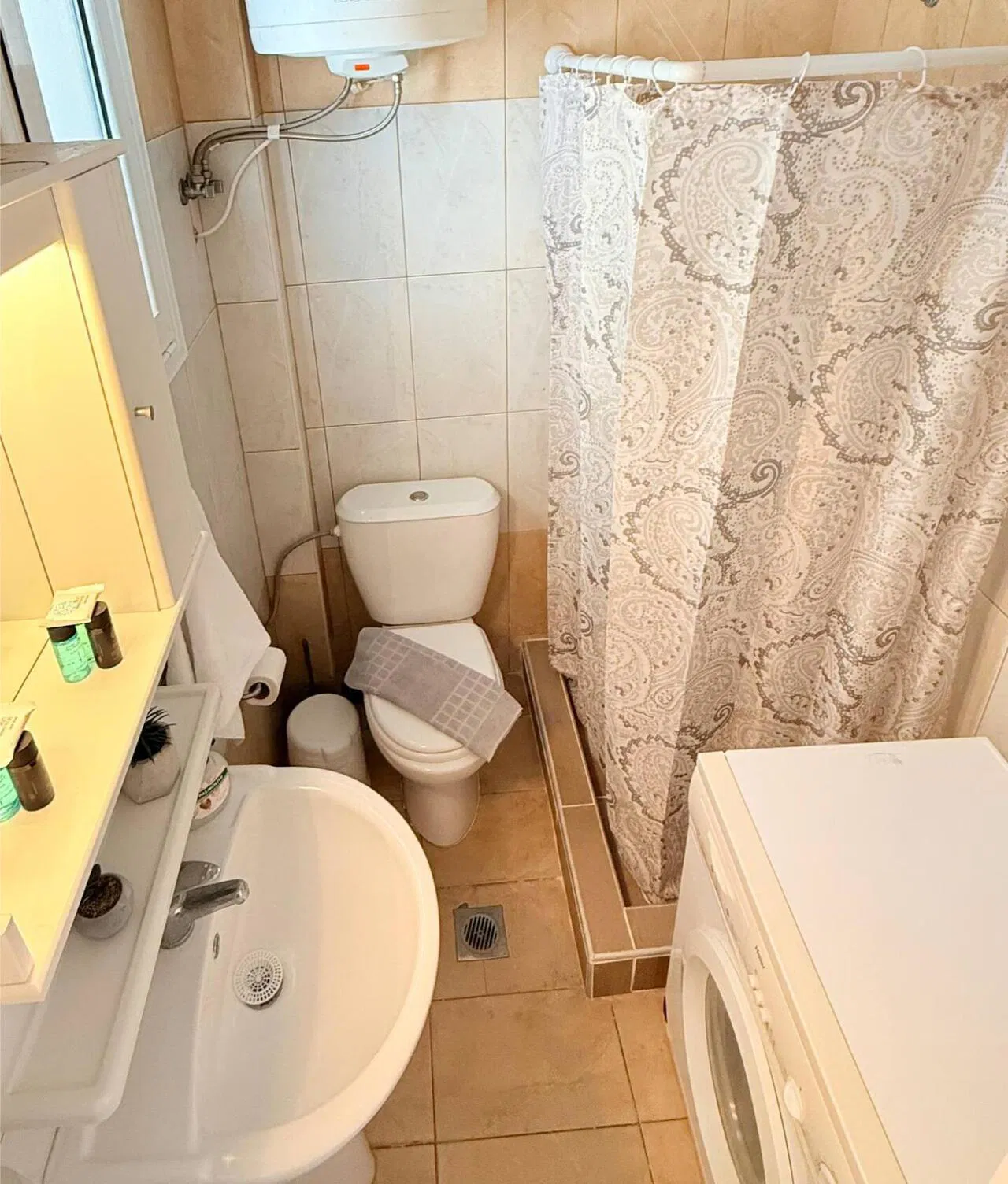 The kitchen includes a large refrigerator with freezer and a stove with oven. There is also a private bathroom with a shower, washing machine, and hairdryer.