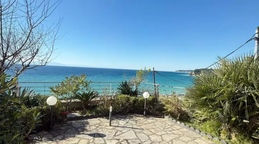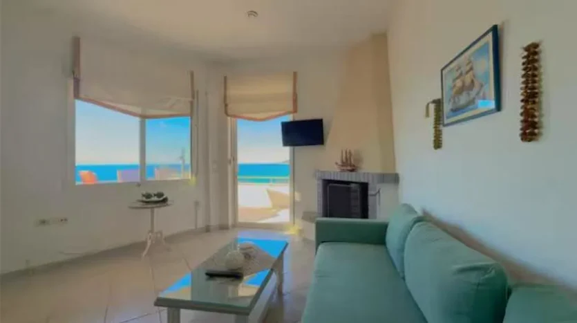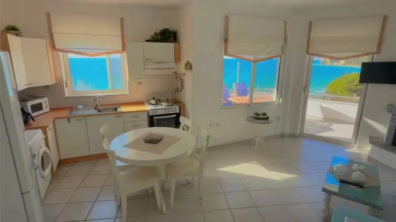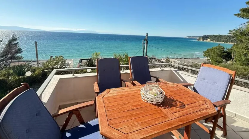 The villa offers two terraces with outdoor seating and dining areas, featuring a beautiful sea view.