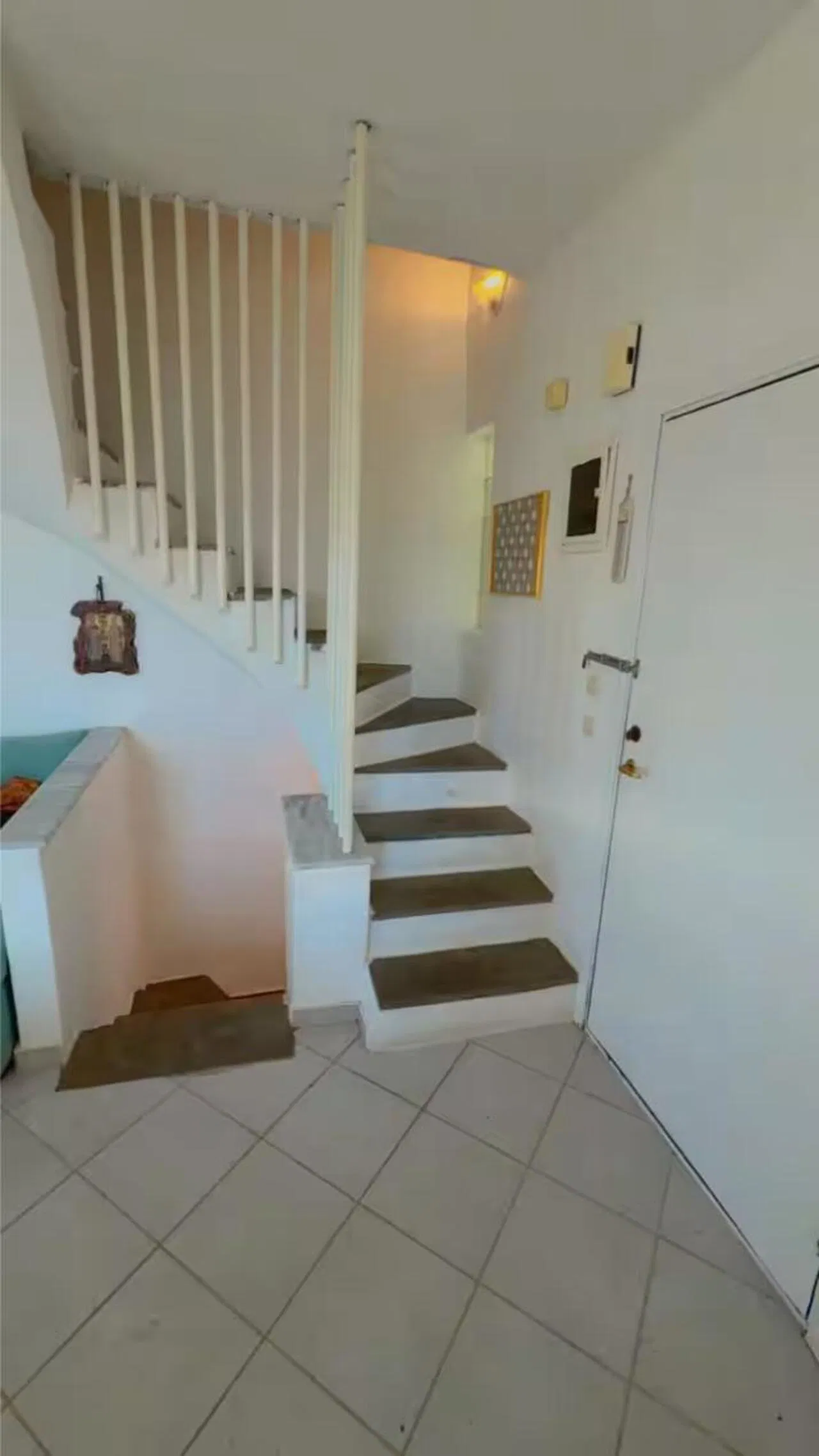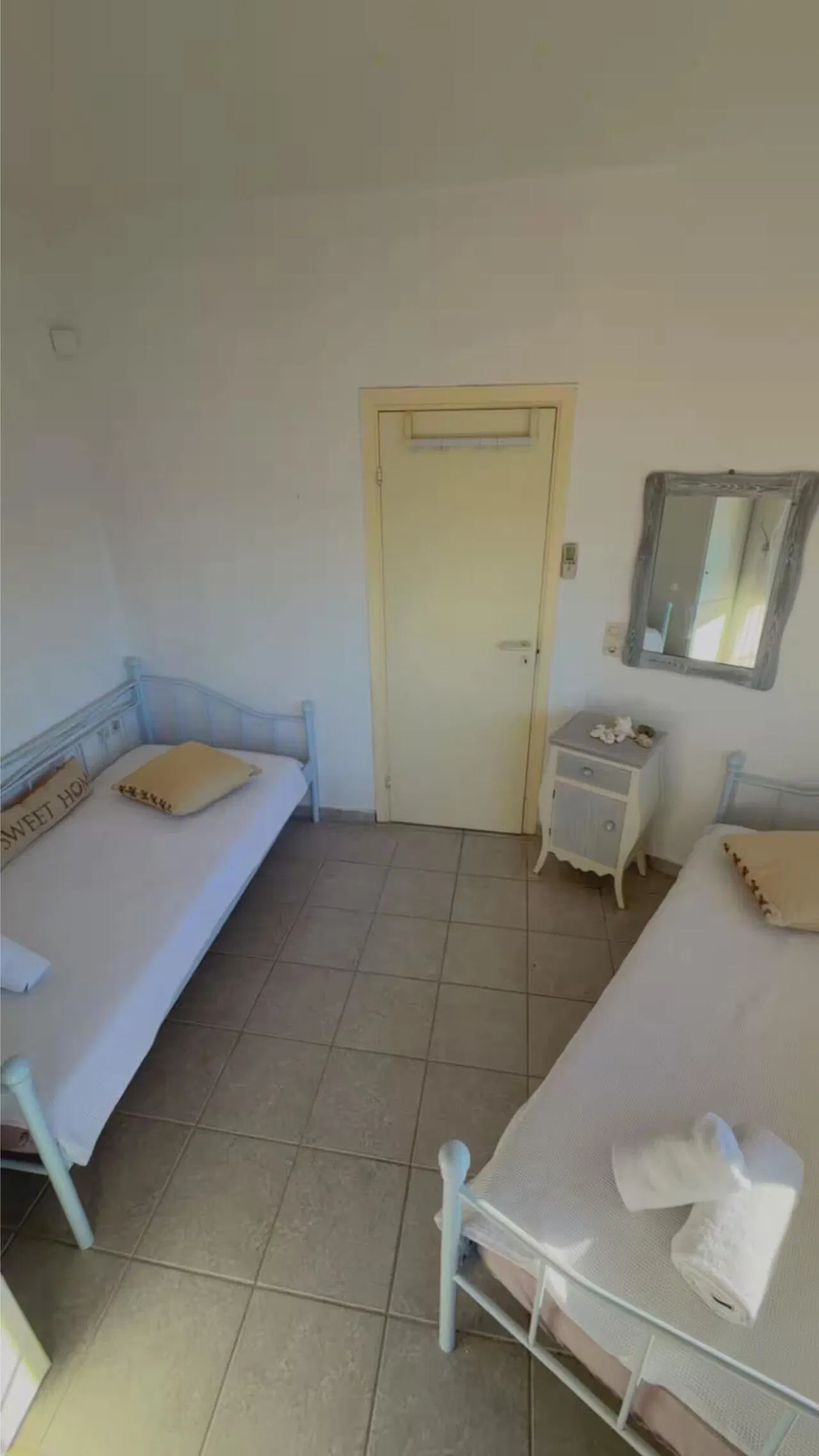 The villa is spread across three levels connected by stairs. It features three bedrooms – two with double beds and one with two single beds. In the living room, there is a large corner sofa bed.